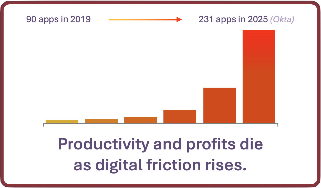 Digital chaos is accelerating. Okta reports 90 apps in 2019 rising to 231 in 2025. Others report as high as 367 apps per enterprise.